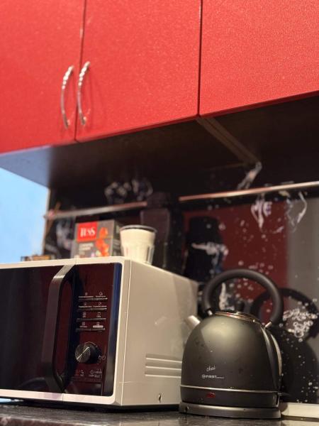 Электрическая плита с духовым шкафом, холодильник, микроволновая печь и чайник;